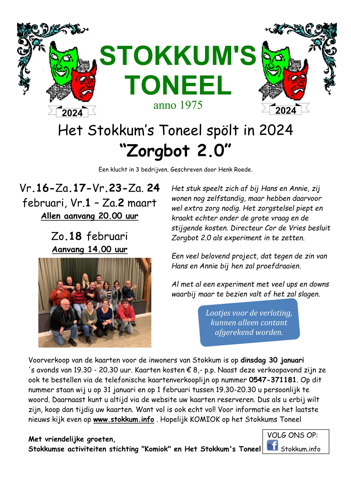 Voor de inwoners van Stokkum start de verkoop van de kaarten op dinsdagavond 30 januari om 19.30- 20.30 uur in het gebouwtje. Wees er snel bij en verzeker je van een goede plek. Kaarten kosten €8,00 p.p.