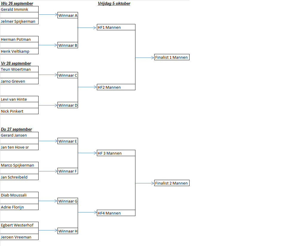 De poule wedstrijden bij de mannen zijn geweest. Het waren echt hele gezellige avonden met biljart op hoog niveau. Er zijn 12 poule winnaars en 4 best nummers 2 obv aan het aantal punten, die doorgaan naar de volgende ronde. Hierbij was zelfs 20 punten alleen niet voldoende voor de volgende ronde. We hebben naar het gemiddelde moeten kijken, om te zien wie er door zijn. In de achtste finale zijn we de volgende mannen terug: Jarno Greven, Levi van Hinte, Egbert Westerhof, Teun Woertman, Adrie Florijn, Marco Spijkerman, Henk Veltkamp, Diab Moussali, Nick Pinkert, Herman Potman, Jan te Hove sr, Gerald Immink, Jelmer Spijkerman, Jan Schreibeld, Gerard Jansen en Jeroen Vreeman