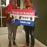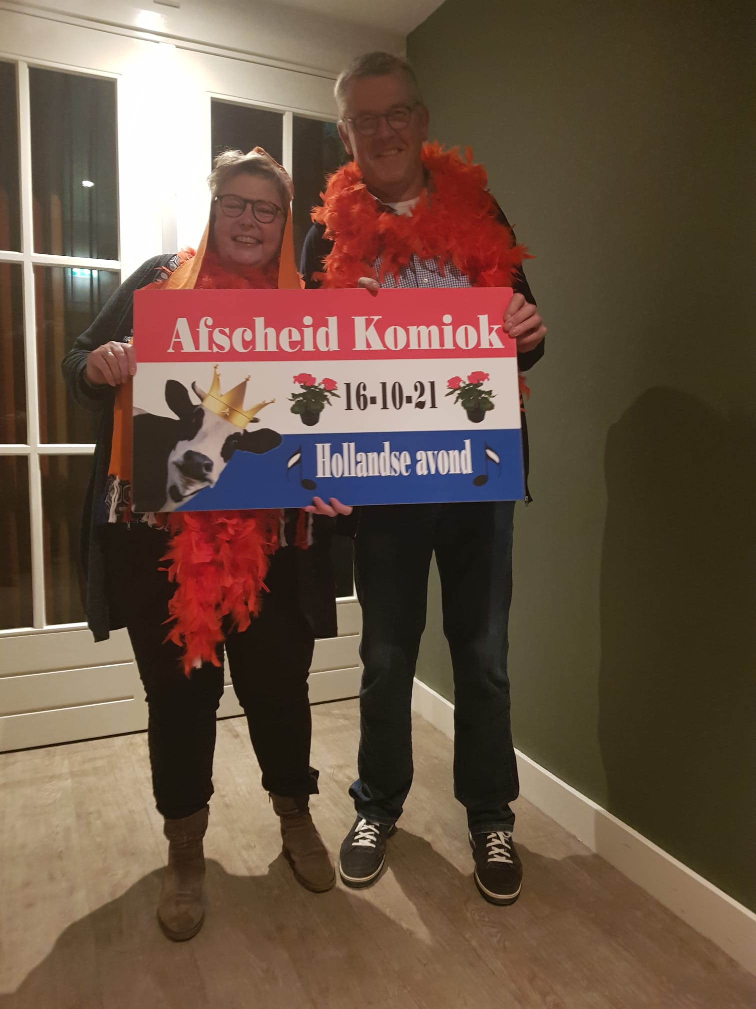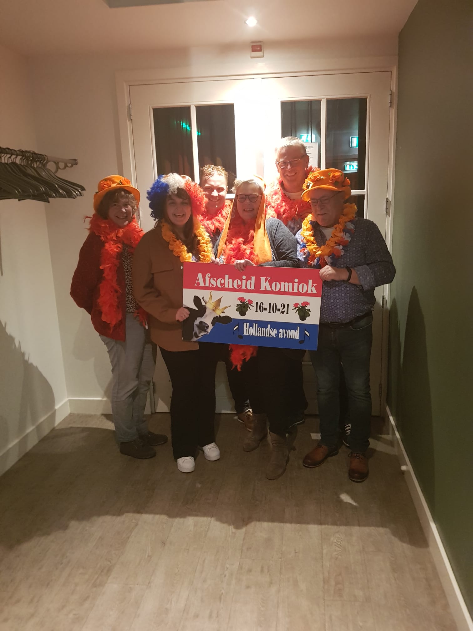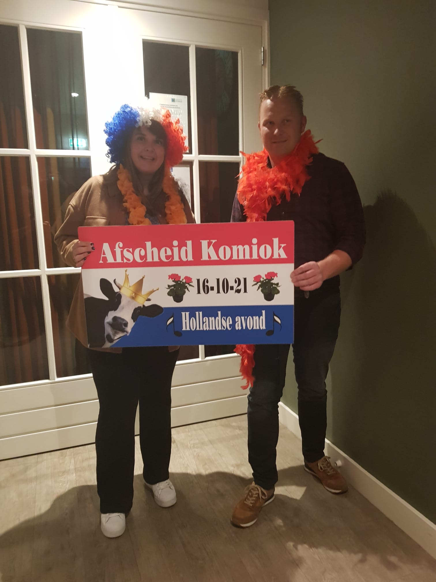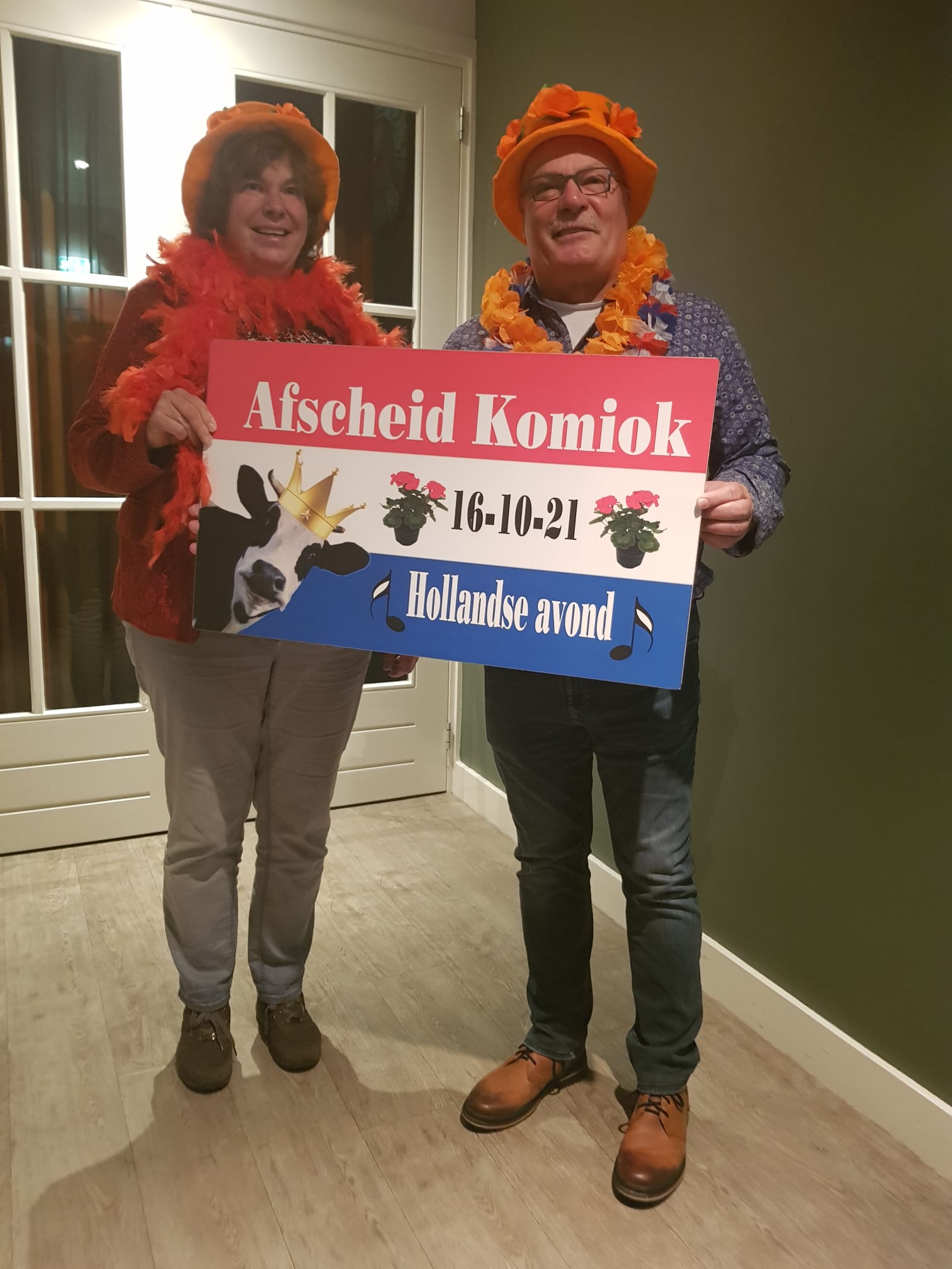 Na een lange tijd van veel corona beperkingen, kon Komiok eindelijk een feestje organiseren voor de leden die afscheid hebben genomen van Komiok. Zaterdagavond, 16 oktober, kwamen Gerrit van Woudenberg, Erna Tijdink en Denise Ligtenbarg, uiteraard met hun partners, aan bij het gebouwtje. Daar werden ze ontvangen met applaus en een lekkere borrel. Vervolgens zijn de oud leden in het oranje gestoken om deze afscheid in stijl vast te leggen: het thema van deze avond was namelijk “Hollandse avond”. Een avond met Hollandse muziek, hapjes en aankleding. Tevens werd er beroep gedaan op onze concentratie- en reactievermogen door het spel “stokken vangen “ te spelen. Dit lijkt makkelijker dan het is! En uiteraard is er een dankwoord gesproken aan deze oud leden en hun partners voor hun deelname en geweldige inzet. Ieder kreeg een waardebon van De Hoestinkhof en een herfststuk van J D Kado ofzo. Kortom, een gezellige avond !