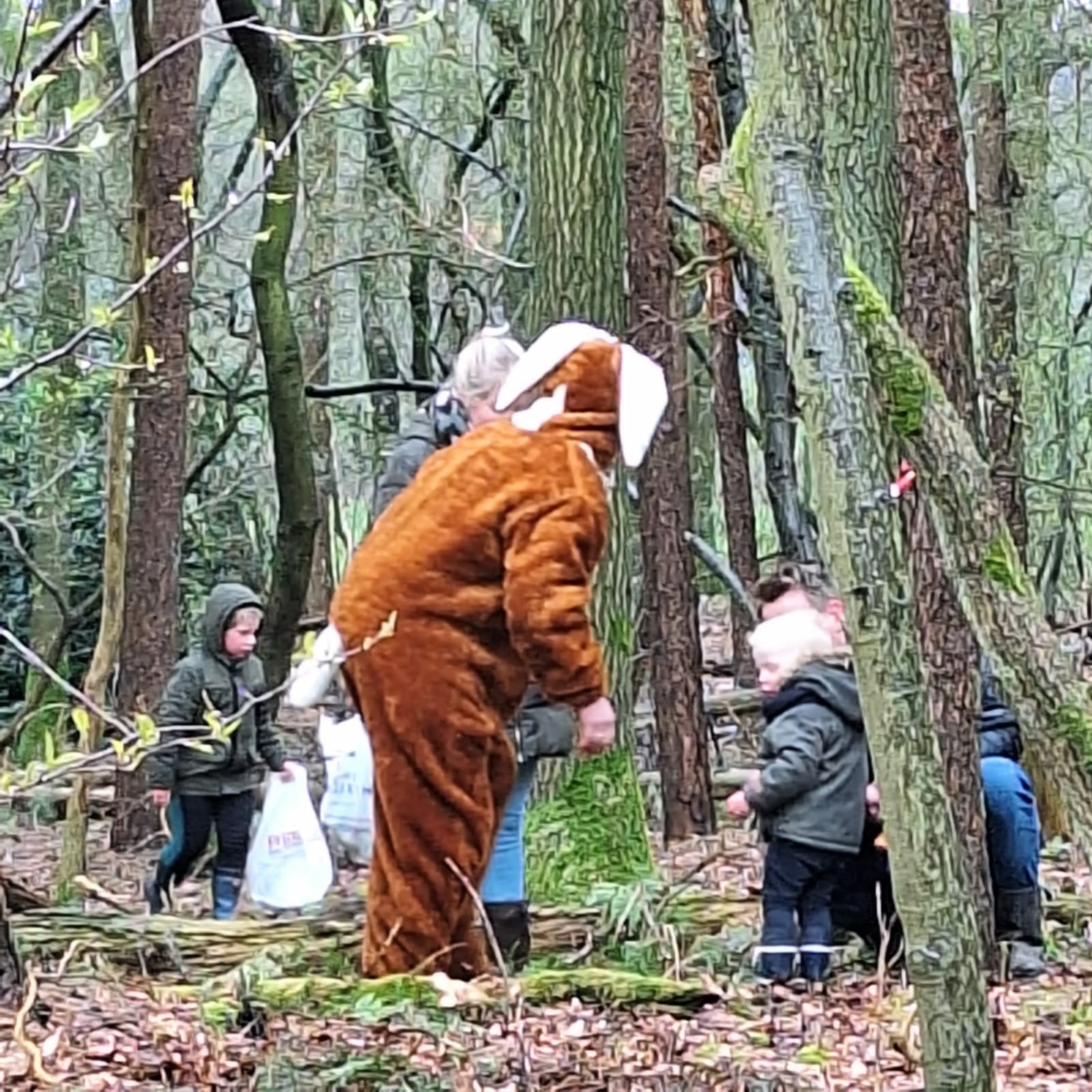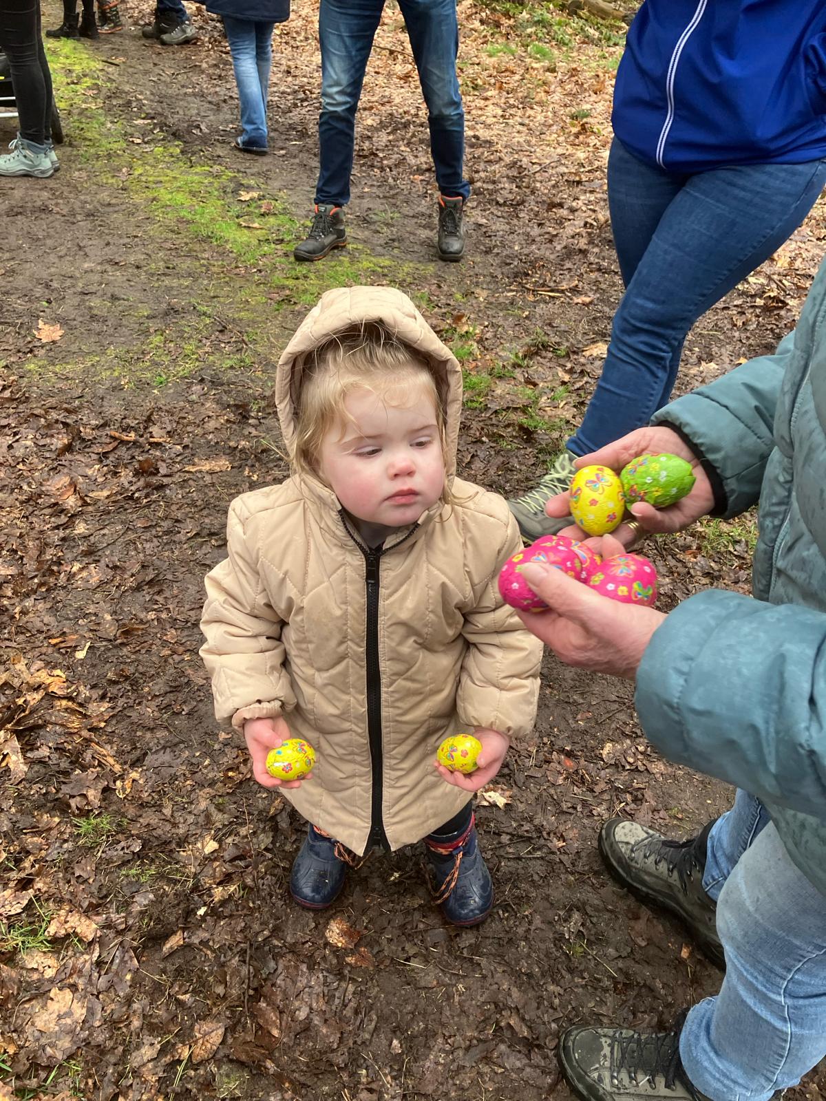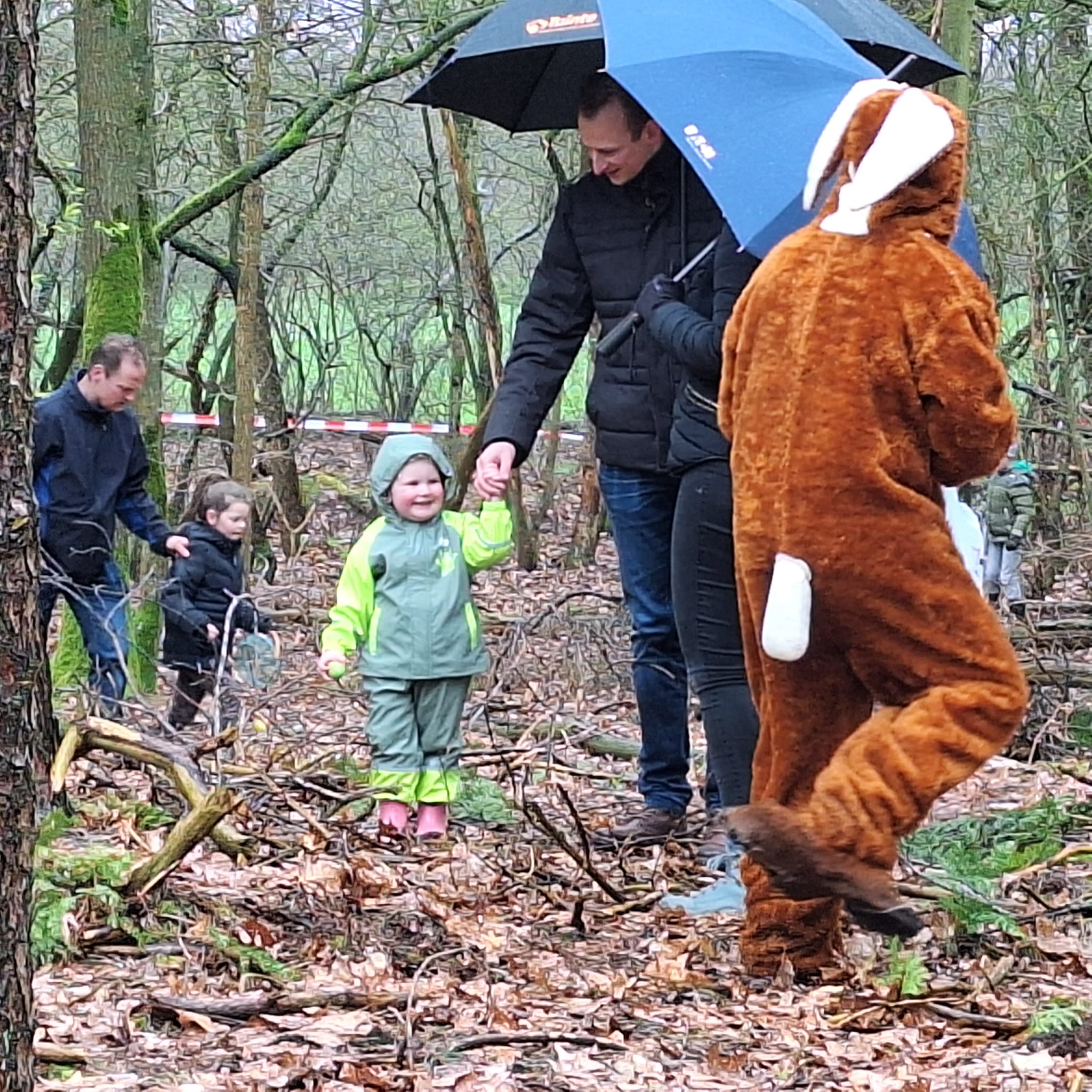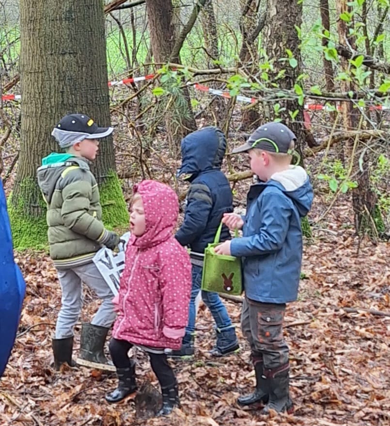 21 kinderen en hun ouders lieten zich niet ontmoedigen door de regenbuien gisteren en gingen op zoek naar de verstopte eieren in het paashazenbos in Stokkum.