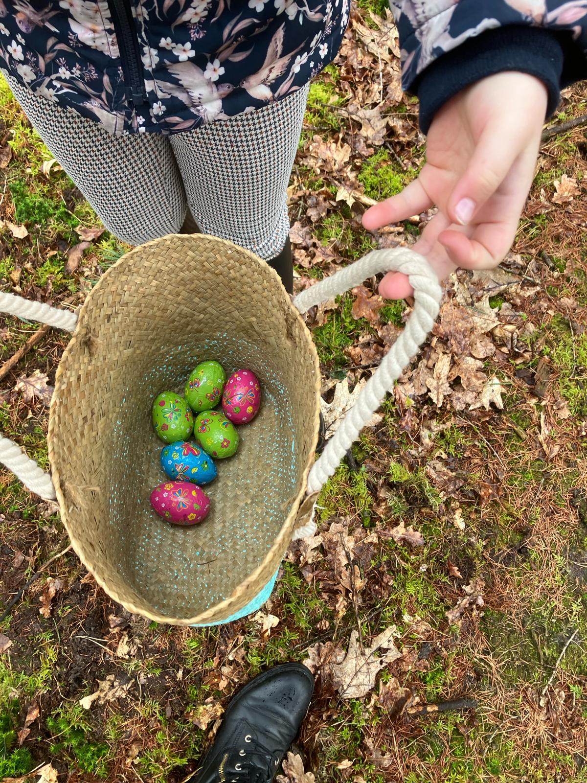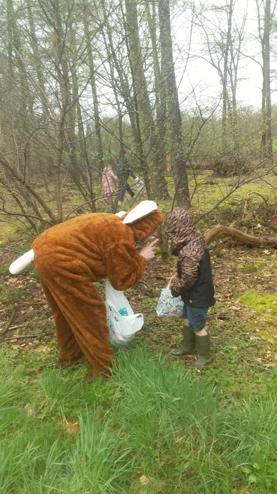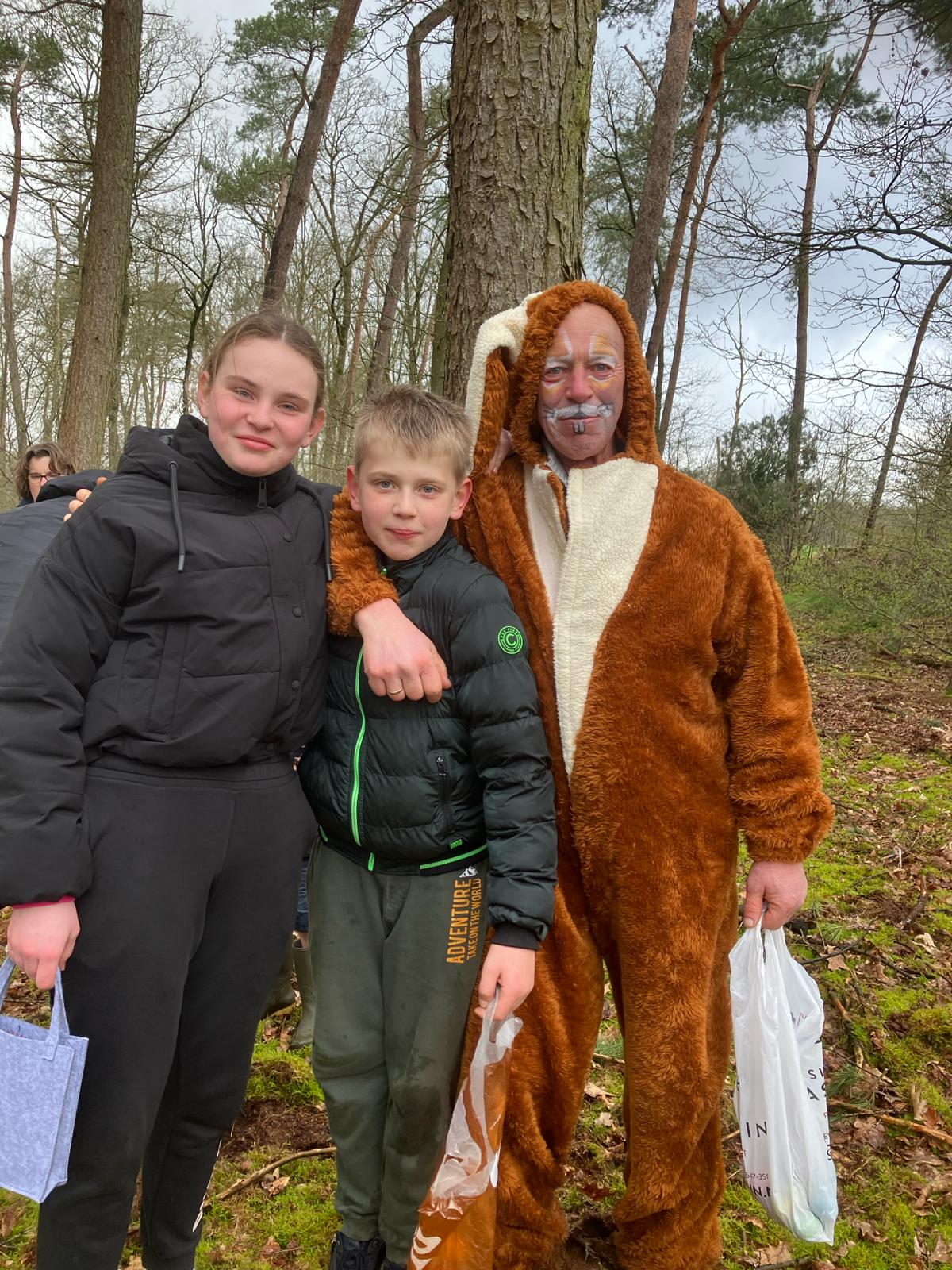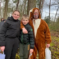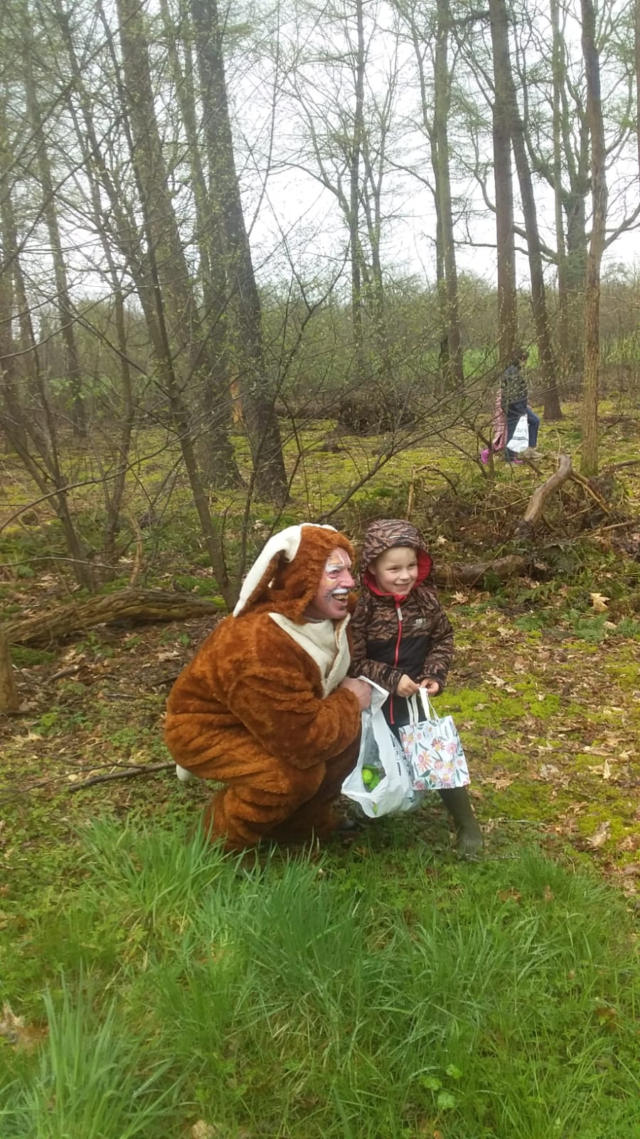 21 kinderen en hun ouders lieten zich niet ontmoedigen door de regenbuien gisteren en gingen op zoek naar de verstopte eieren in het paashazenbos in Stokkum.
