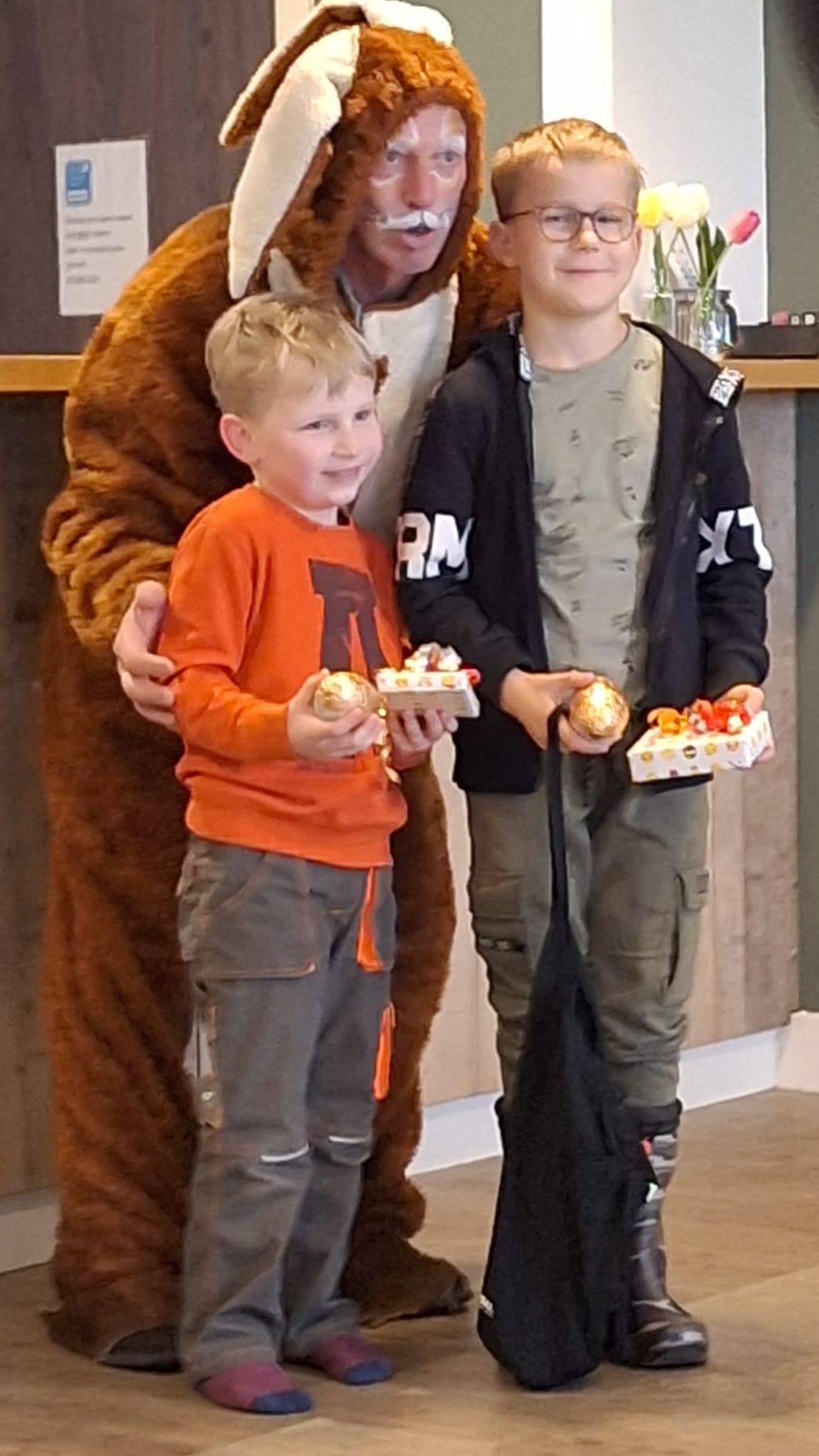 De gouden eieren werden gevonden door Tim Potman en Lucas Wittenberg, zij kregen hiervoor een leuk prijsje. Deze werd na het zoeken in een lekker warm en droog gebouwtje uitgereikt door paashaas Harm.