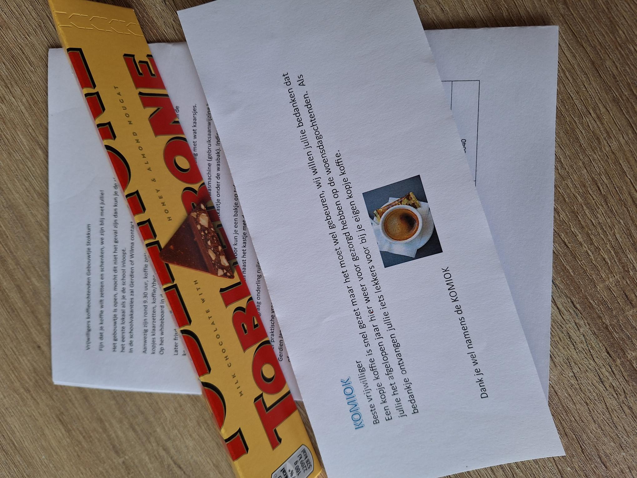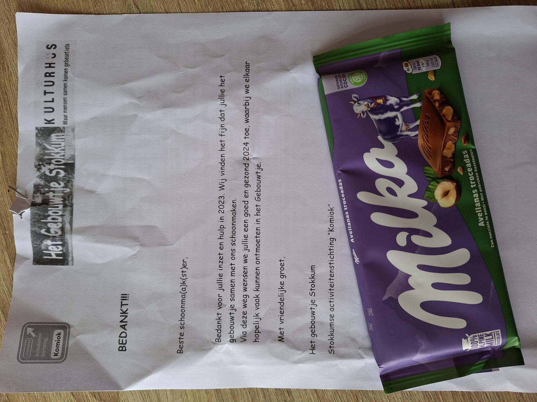 Zowel het Gebouwtje als de KOMIOK kan niet zonder de hulp van vrijwilligers; zij onderhouden het Gebouwtje van binnen en buiten, maken het gebouwtje schoon, schenken koffie tijdens de koffie-ochtenden, helpen de tent opzetten bij de verhuur, enz, enz. Deze mensen zijn o zo belangrijk maar willen vaak niet in de belangstelling staan. Een klein bedankje is dan zeker nodig en deze zijn de afgelopen tijd weer verstrekt, zie een paar voorbeelden hiervan op de foto's.