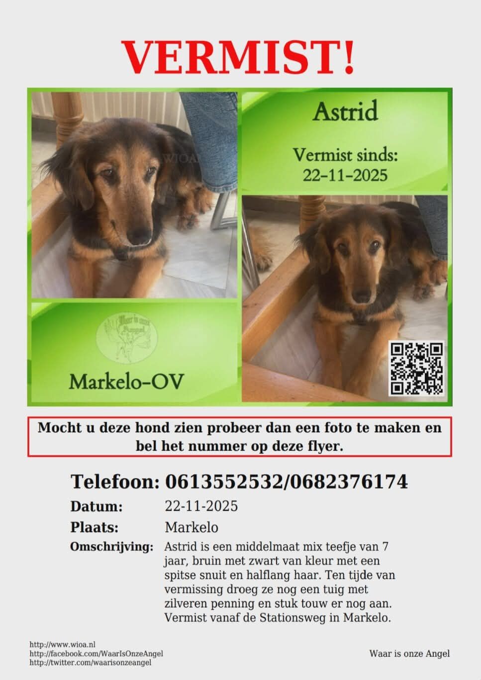 De 7-jarige hond Astrid wordt sinds zaterdagmiddag vermist. Het middelgrote teefje verdween vanaf de Stationsweg in Stokkum. Zondagmiddag is ze nog gezien op de zandweg tussen Kerkweg en Stokkumerweg, maar sindsdien ontbreekt elk spoor. Astrid is een hond met een mix van bruin-zwarte vacht, een spitse snuit en halflang haar. Bij haar verdwijning droeg ze een tuigje met een zilveren penning en zat er nog een stuk touw aan vast.