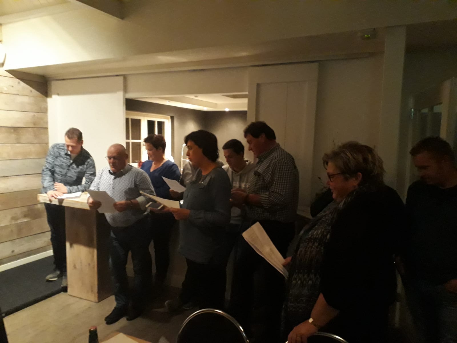 Tijdens de gezellig avond werden ze toegezongen door de andere bestuursleden. En dat klonk als een klok! Er was een geheel eigen tekst geschreven op het nummer "Leef" van Andre Hazes. Het refrein ging als volgt: