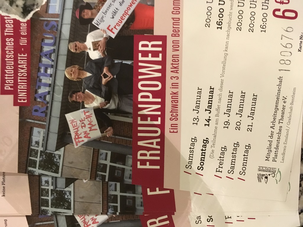 Gisterenavond is een delegatie van het Stokkums Toneel op bezoek geweest bij haar duitse partner het Laienspielschar Venhaus. In een volle zaal Spieker werd daar voor de 4de keer het stuk "FrauenPower" opgevoerd, van de duitse schrijver Bernd Gombold. Het was wederom een perfecte opvoering en ondanks dat het "plat Duuts" soms even tot nadenken aanzette, was het goed te volgen en we hebben dan ook geweldig genoten van dit toneelstuk. Het was overigens hetzelfde stuk waarmee 3 jaar geleden ook het Brook Toneel veel succes had, maar dan onder de titel "de raod van Kloetenbarg".