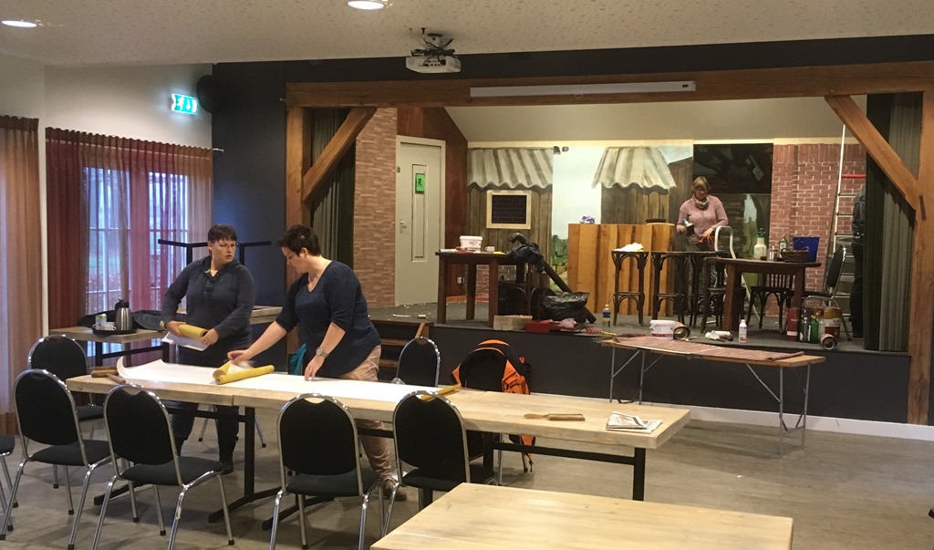 De uitvoeringen van het Stokkums Toneel naderen met rasse schreden. Zo zijn afgelopen weken de handen flink uit de mouwen gestoken, er is al getimmerd en behangt, om het Toneel een facelift te geven. Het is nog lang niet af, maar om u alvast een inkijkje te geven….. Was het vorig jaar een buitentafereel, nu is een dorpscafé de locatie van het Stokkums Toneel 2019.