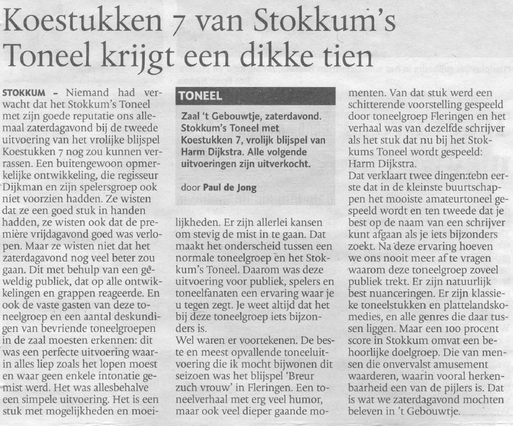 Maandag 16 febr. 2009; Koestukken 7 van Stokkum's Toneel krijgt een dikke tien