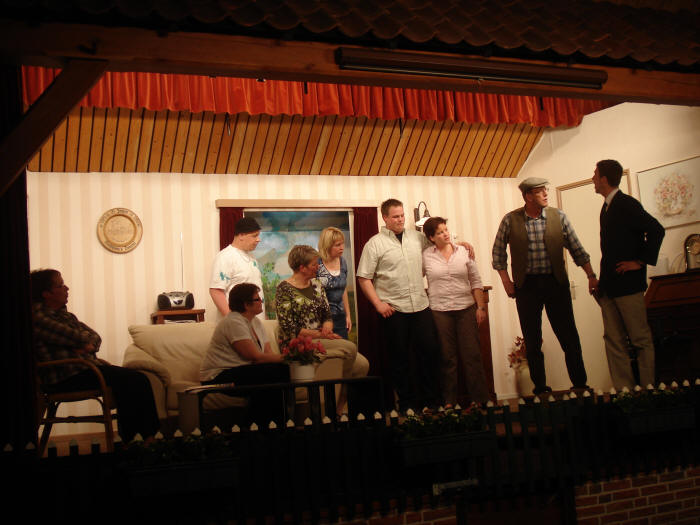 Een gezellig gevulde zaal kon gisterenavond genieten van een goed gespeeld stukje toneel met keer op keer lachsalvo van de eerste orde. Na afloop konden de spelers dan ook veelvuldig de complimenten in ontvangst nemen, hulde! Hulde was er ook voor Bert Rozeboom, die alweer voor de 35ste keer de grime verzorgde, dit jaar geassisteerd door Marleen Dijkman.